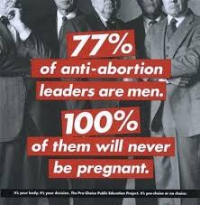 In the image above, it says "77% of anti-abortion leaders are men. 100% of them will never be pregnant." What is so important about what is said in the picture is because men voting on abortion laws, something that is a big and important issue in our society today, are in fact MEN. They have no idea the ordeals a woman has to go through for an abortion to actually happen, and it's not like abortion is taking away anything from these men besides disagreeing with their ideologies and beliefs. The reason why this piece is so powerful is because numbers are definitely something that is perceived as eye-catching to humans and to see a number as 77% makes you realize how close that is to the number 100 and how that many men should not have the power to make decisions about issues that are made for women.